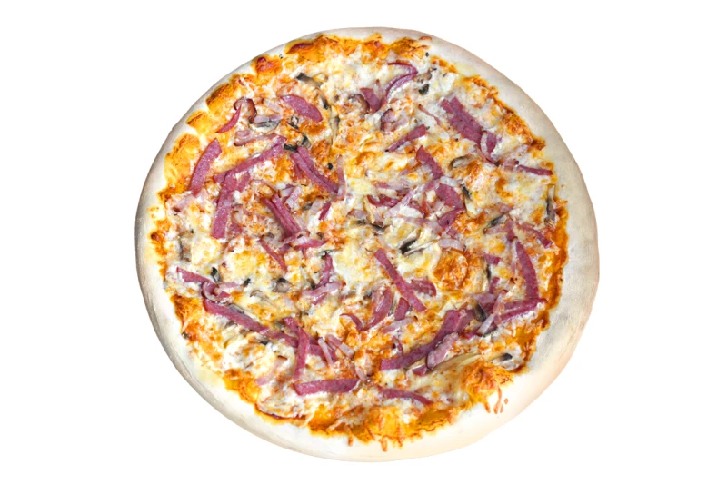 пышное тесто, салями, бекон, шампиньоны, сыр, пикантный томатный соус