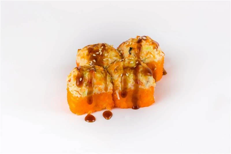 рис, нори, сливочный сыр, лосось Терияке, томат, тобико, перец Болгарский, огурец, крабовые палочки, майонез