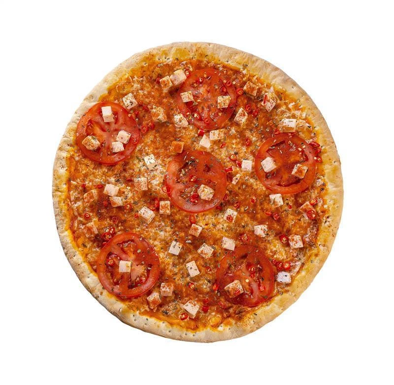 Пикантный томатный соус, сыр, куриное копченое филе, помидоры, перец чили, красный молотый перец, сушеный базилик